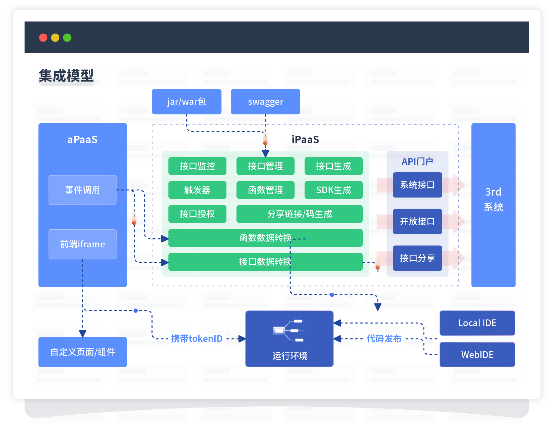 集成模型包括平台本身前、、、、后端能力的扩展,,,,,也支持通过API门户和第三方系统进行交互。。。。。。。。