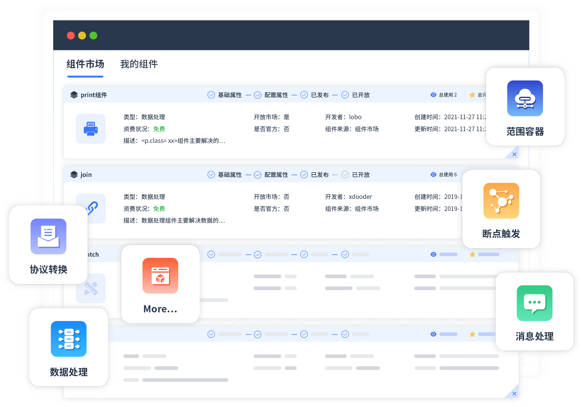 针对集成场景,,,,,,NO钱包提供组件市场,,,,,,,,例如协议转换、、、、、、、、消息处理、、、、、文件操作等。。。。。。。。。除平台提供的组件外,,,,,,,,,,客户可以自定义所需组件。。。。。。。