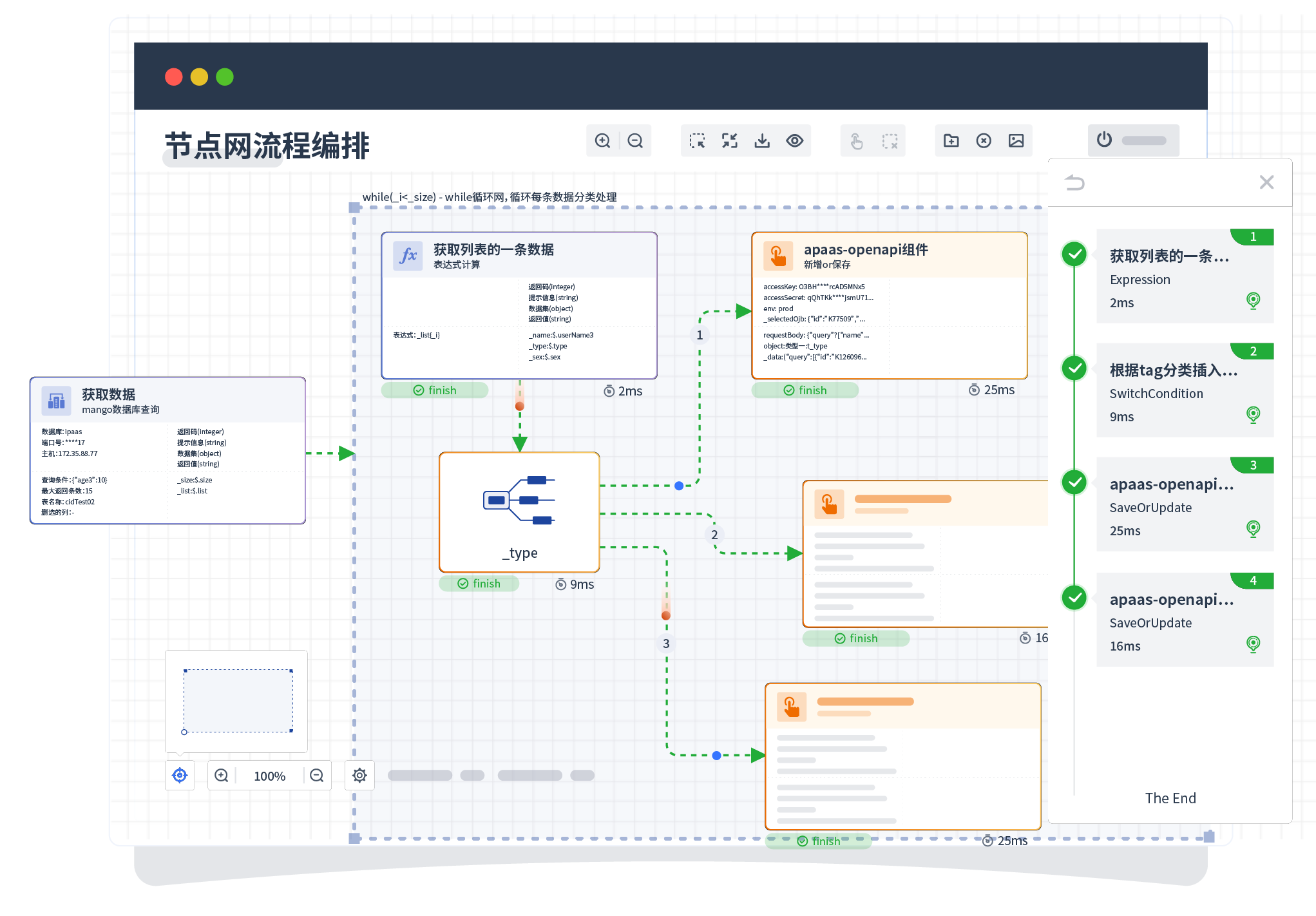 针对集成场景,,,,,,,,,,组件定义后支持进行流程编制,,,,,,,,,,,,,不同于传统代码方式,,,,,,,,,,,,,通过图形化展示,,,,,,,支持在线调试、、、、、、、、日志查看和运行回放。。。。。。。。