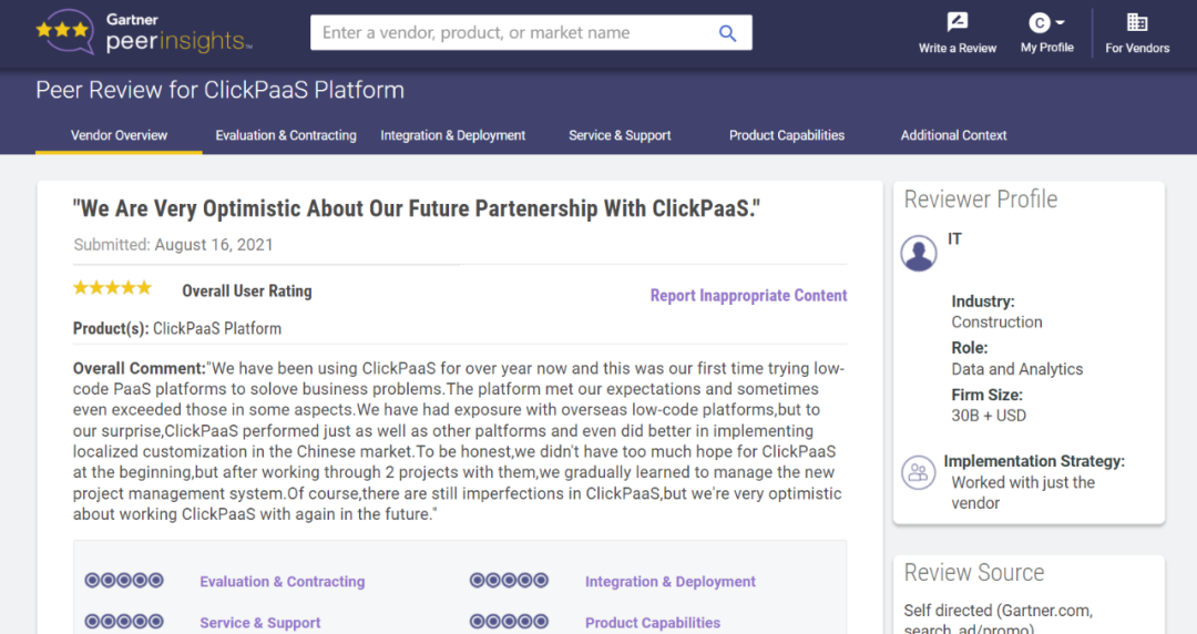 Tips::::::::::::【Peer Insights】——用户对企业IT产品和服务发布真实评价的平台。。。。。。。。。。。。。目前已有355个市场,,,,,,255,000条经过验证的评价。。。。。。。。。每一条评价Gartner会针对参评企业营收规模及参评人员信息做验证、、、、、、、、、、、、评价内容做多维核实。。。。。。。。