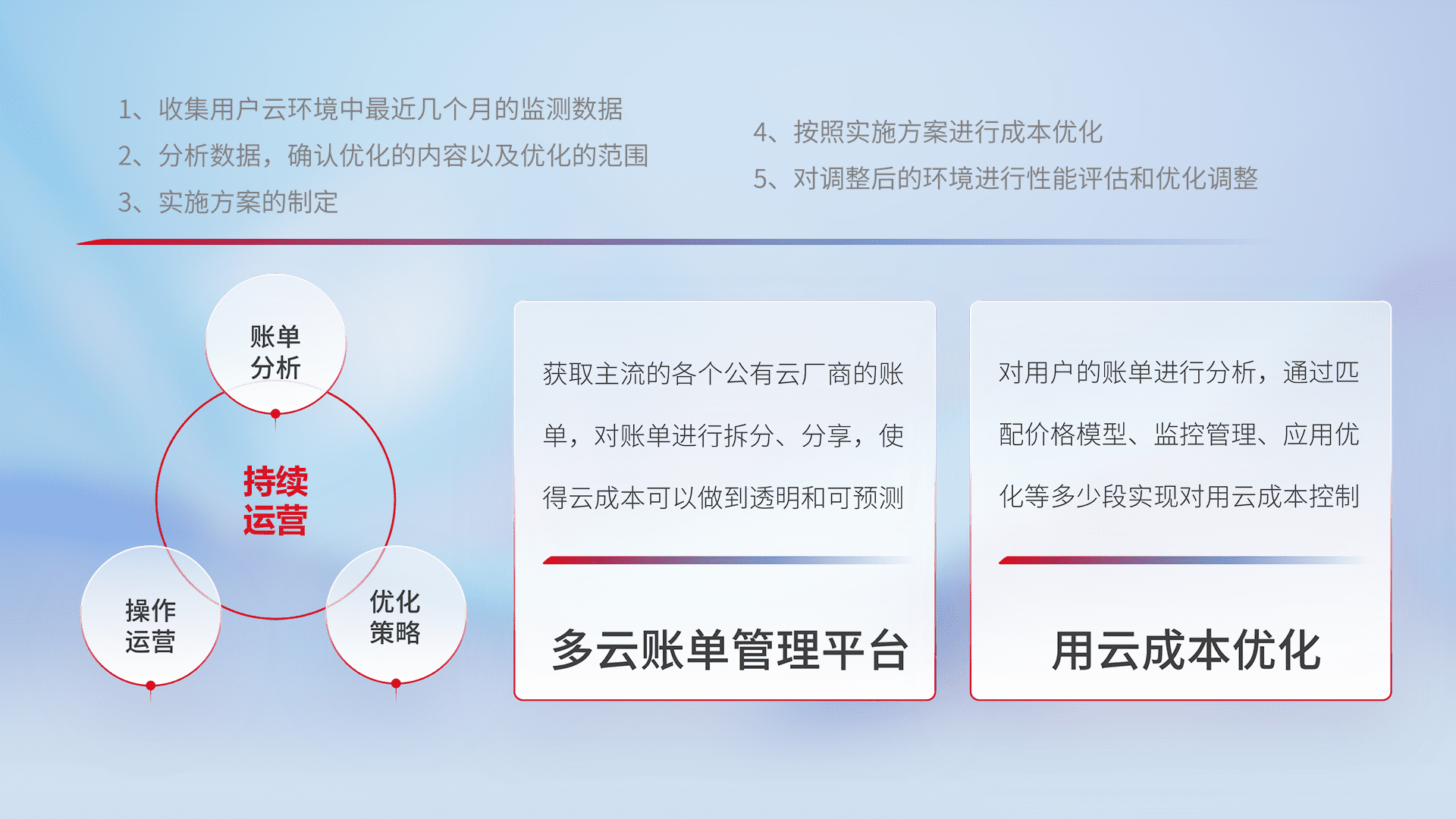 通过多云纳管,,,以统一的资源数据模型把客户的云资源进行抽象和封装,,进而实现对多云资源的统一操作,,,,保障云资源管理的可靠性、、稳定性与可用性。。。。量身定制化运维内容,,,配置、、、、开发运维、、、补丁管理、、、备份、、、、监控、、、、认证和访问管理、、、、审计和日常巡检等,,保障在用云过程中的可靠度,,,,稳定度以及高可用率。。