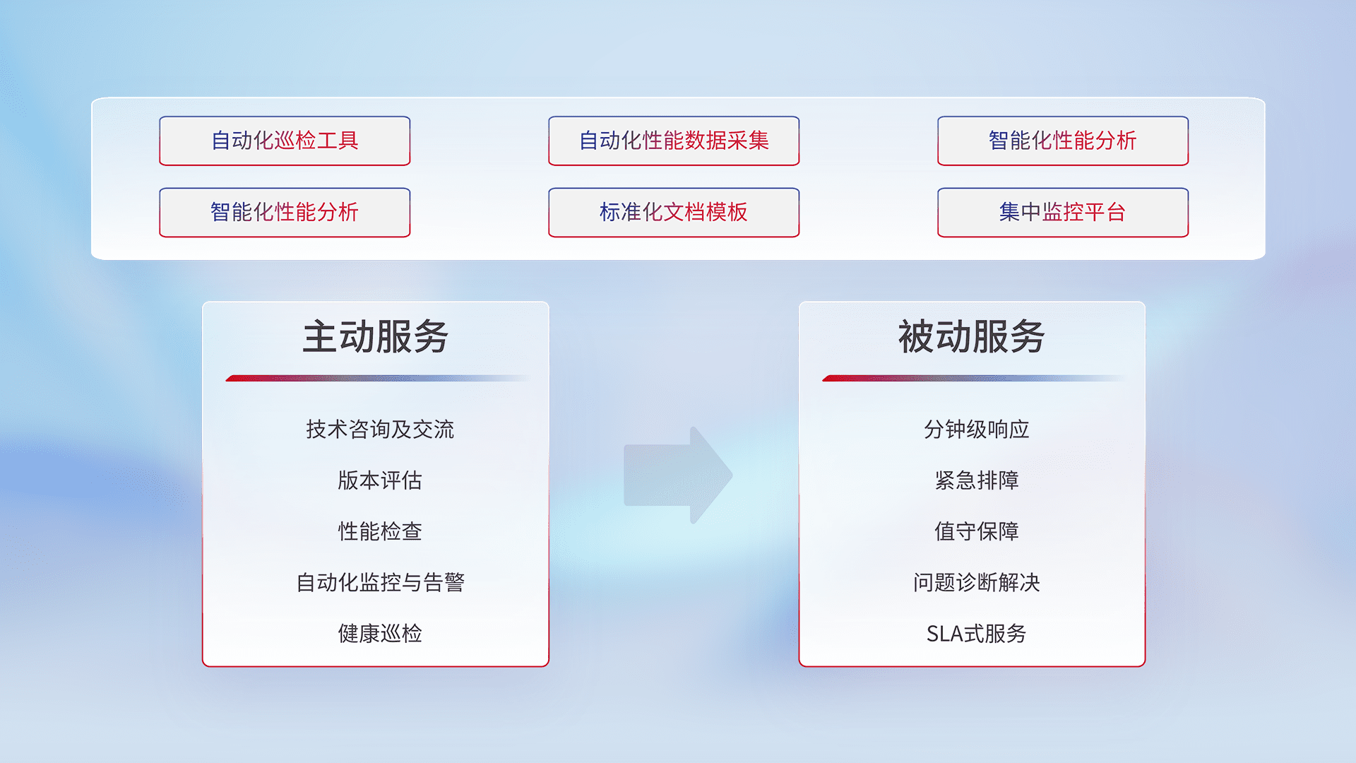 智能化工具和标准化文档,,,保障服务质量,,,提供主动服务(包含技术咨询、、版本评估、、、性能检查、、、自动化监控与告警、、、健康巡检)和被动服务包含(分钟级响应、、、、紧急排障、、、、值守保障、、问题诊断解决、、、SLA服务)。。。